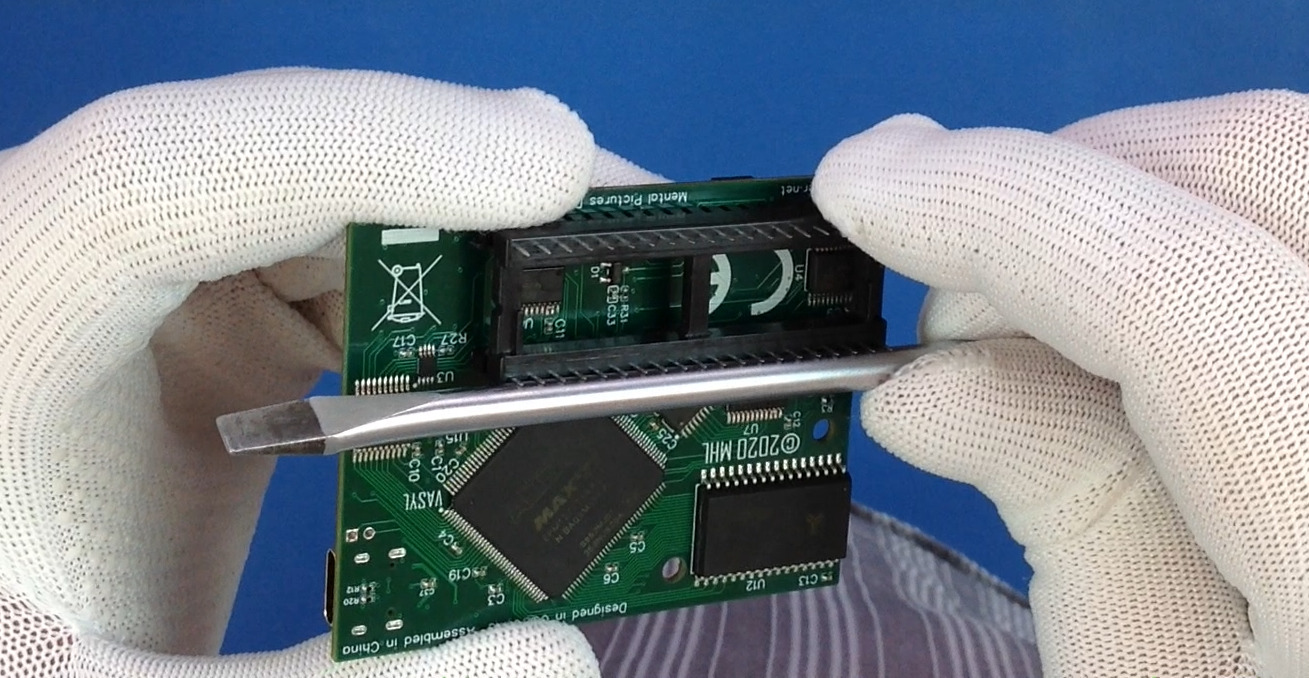- The unit should not be too easy to remove. If it requires close to zero force to remove the board - that's a warning sign. Typical reason for such loose fit is the original socket's fatigue. In such case you may be able to temporarily work the symptoms around by using a round pinned riser socket instead of the supplied flat pinned one. Still, even if this works short-term, we suggest replacing your original VIC-II socket by a well trained technician